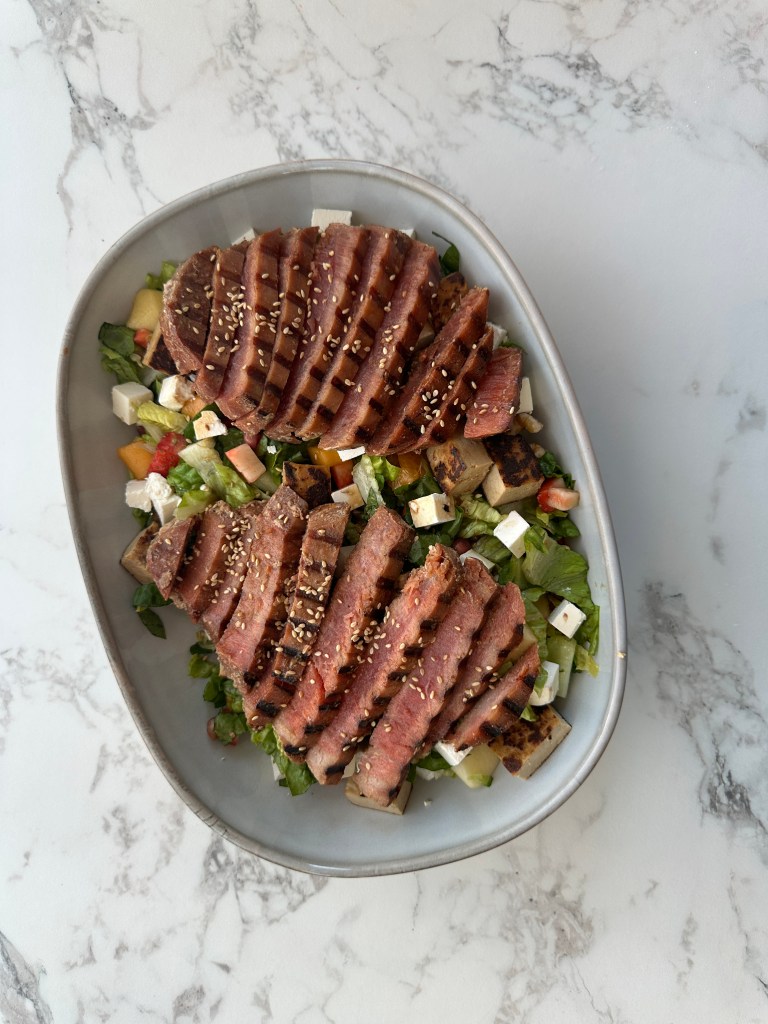 Let the tuna steaks rest and cool before slicing them. Lay them over the salad and sprinkle the sesame seeds on top to finish.